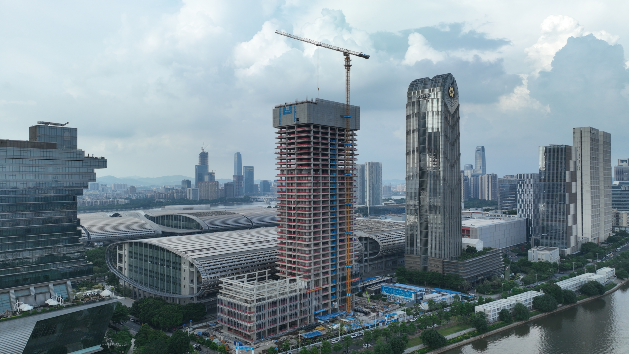 6月9日,廣交會展館四期項目指揮中心主體結構順利封頂。指揮中心是四期項目中“海拔”最高的建筑,由1棟171.9米高的塔樓和4層裙樓組成,集會議功能與日常辦公于一體。目前,指揮中心幕墻工程已展開安裝,預計今年12月底完成建設工作。